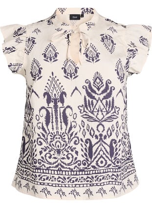 Ærmeløs bluse i en blød og let viskosekvalitet med et dekorativt all-over print. Blusen har en regulær pasform og er designet med rund halsudskæring med slids og bindedetalje samt flæsekant ved skuldrene.