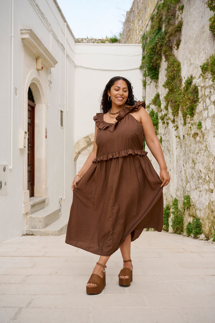 Ærmeløs kjole i en blød viskosekvalitet med a-formet pasform og midilængde. Kjolen er designet med brede skulderstropper og V-udskæring foran og bagpå, begge afsluttet med en bred flæsekant. Taljen markeres med en gennemgående flæsedetalje, som skaber en feminin silhuet.