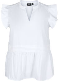 Ærmeløs top med flæseærmer og fine, dekorative folder i taljen, som skaber en feminin silhuet. Toppen er designet med flæsekrave og v-udskæring, og er fremstillet af en blanding af 65% genanvendt polyester og 35% bomuld.