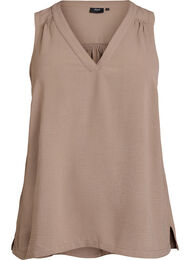 Top uden ærmer fremstillet i et let materiale med 51% genanvendt polyester og tekstur. Toppen har en regulær pasform med slids i siderne, v-udskæring og smock-detaljer, som skaber nogle fine draperinger