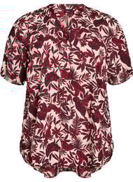 Bluse med regulær pasform og korte ærmer med elastikafslutning samt rund hals med V-åbning. Blusen er fremstillet i et let og tekstureret materiale med 70% genanvendt polyester og et tropisk inspireret blomsterprint.