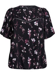 Blomstret bluse med rund halsudskæring, korte, løse ærmer med rynkeeffekt på skuldrene, dekorativt blondebånd over brystet og en regulær pasform. Denne bluse indeholder 51% LENZING™ ECOVERO™ Viskose-fibre, som tilfører naturlig blødhed og fald.
