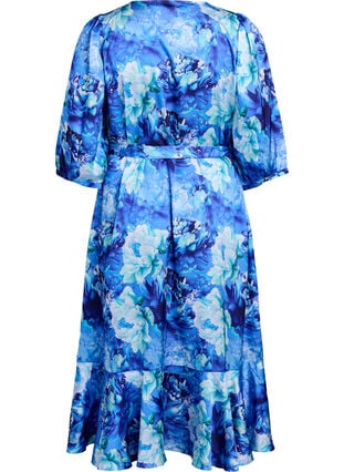 Elegant midilang slå-om kjole i et shiny materiale med et smukt blomstermønster og dekorativ flæsekant forneden. Kjolen har 3/4-lange ærmer med let pufeffekt, V-udskæring og en slå-om-effekt, der bindes i siden og skaber en feminin silhuet.