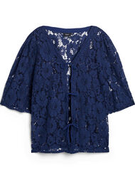 Feminin blondebluse med smukke blomsterdetaljer i et let og elegant design uden lining. Blusen har en regulær pasform, løse trekvartlange ærmer og en åben front med tre fine sløjfer som dekorative lukninger.