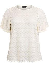 Elegant blondebluse med korte, løstsiddende ærmer, rund halsudskæring og regulær pasform. Blusen er lavet i en blød og let transparent blonde uden lining, med bølget kant forneden og et dekorativt mønster, der giver et feminint og luftigt udtryk.
