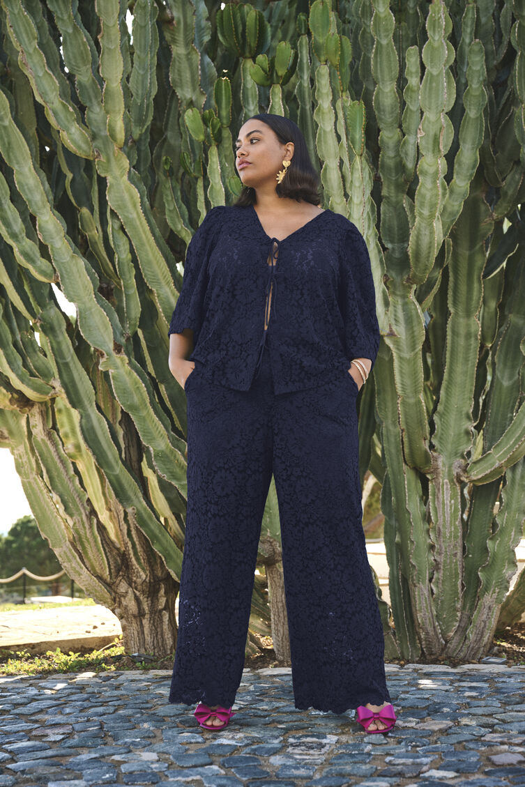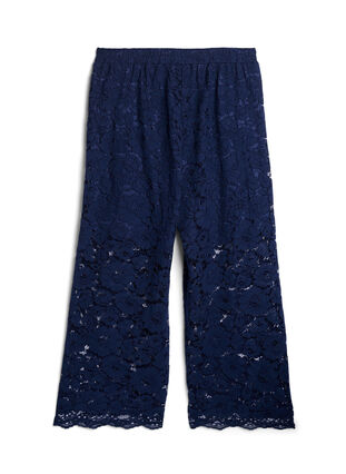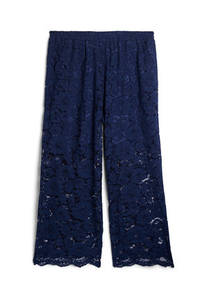 Feminine bukser i smukt og strækbart blondestof med indershorts. Bukserne har en høj talje med elastisk linning, sidelommer og en løs pasform, som afsluttes med en fin bølgekant forneden.