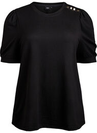 Bluse med korte pufærmer, rund hals og en fin detalje på skulderen med smukke knapper. Blusen har en regulær pasform og er fremstillet af et blødt og behageligt materiale med 50% genanvendt polyester