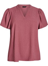 Bluse i et let materiale med tone-i-tone leopardtekstur. Blusen har korte flæseærmer, V-udskæring og en behagelig A-facon.
