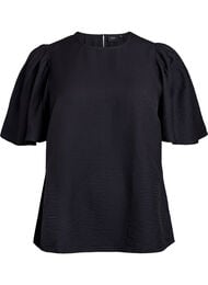 Bluse med regulær pasform, rund halsudskæring og nøglehulslukning i nakken. Ærmerne er albuelange med ekstra vidde og fine rynkedetaljer ved skuldrene. Denne bluse indeholder 92% LENZING™ ECOVERO™ Viskose-fibre, som tilfører naturlig blødhed og fald.
