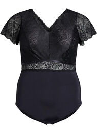 Elegant bodystocking med korte ærmer og V-udskæring. Overdelen er i blød blonde med elastik under barmen, som giver let støtte. Ryggen er delvist transparent og har en lukning med et lille guldfarvet spænde samt elastik, der giver ekstra komfort og støtte. Underdelen er i glat, strækbar mikrofiber med brief-pasform, som dækker hele bagdelen. Bodystockingen lukkes forneden med praktiske trykknapper.