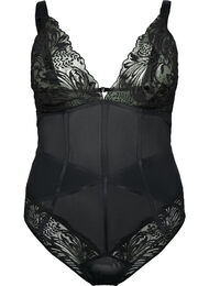 Smuk bodystocking med mesh og feminine blonder. Bodystockingen har en dyb v-udskæring, justerbare skulderstropper og skjulte trykknapper i kilen.