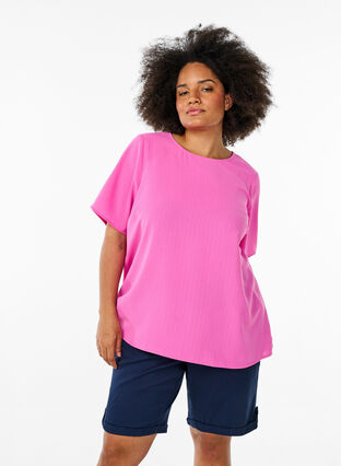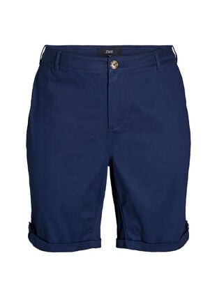 Chino shorts i en strækbar bomuldskvalitet med høj talje og bæltestropper. Shortsene har sidelommer, baglommer med lommefor og en lige pasform, der sidder behageligt uden at stramme. Benene afsluttes med fast opsmøg og dekorativ knapdetalje.