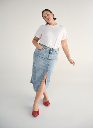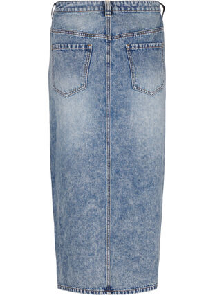 Cool maxinederdel i blød denim med en lys, vasket finish, der giver et tidløst look. Nederdelen har lynlåslukning med knap, lommer, bæltestropper og en frontslids, der sikrer god bevægelsesfrihed.