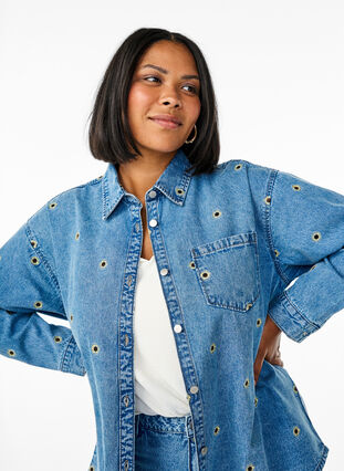 Denimskjorte af 100% bomuld med brystlomme og fine broderede blomster. Skjorten er designet med en krave, gennemgående knaplukning og en løstsiddende pasform.