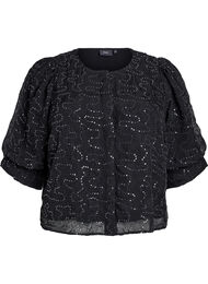 Festlig bluse i let transparent, krinklet materiale med diskrete tone‑i‑tone pailletter. Designet i regulær pasform med rund hals, skjult knaplukning foran samt 1/2‑lange pufærmer med brede manchetter og knapdetalje. Den bløde viskoseforing sikrer optimal komfort.