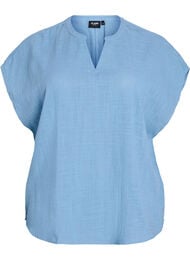 Luftig bluse i 100% bomuld med tekstur og løs pasform. Blusen har rund hals med lille V-snit foran og korte cap sleeves, der dækker toppen af skuldrene og giver et let og feminint udtryk. Den løstsiddende silhuet gør blusen behagelig og velegnet til varme dage.