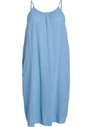 Sommerlig og enkel stropkjole i en luftig bomuldskvalitet med tekstur. Kjolen har en afslappet pasform med midi-længde, rynkedetalje langs udskæringen foran og justerbare spaghettistropper.