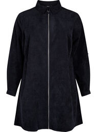 Kort skjortekjole i blød og strækbar fløjlskvalitet med 51% genanvendt polyester. Kjolen er designet med 3/4 ærmer med opsmøg, lynlåslukning og en løstsiddende a-form.