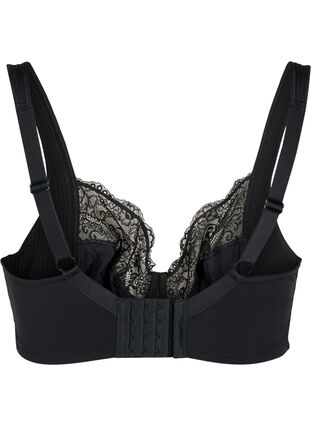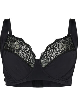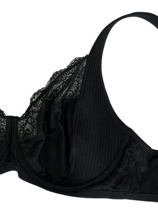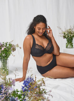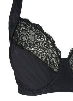 Full cover bh med bøjle og blondedetalje. Denne bh er designet med vatterede paneler, der strækker sig fra de brede, bløde stropper ned i skålene, hvilket sikrer en forstærket side-support, komfort og aflastning for skuldrene.