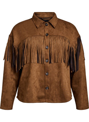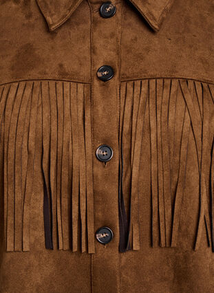 Indendørsjakke i blød imiteret ruskind med gennemgående knaplukning og klassisk krave. Jakken har lange ærmer, en regulær pasform og designet med frynser over bryst og ryg, som skaber et cool western-look.