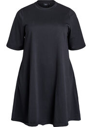 Knælang jerseykjole med rund hals, korte ærmer og diskrete lommer i siden. Kjolen har en løs og afslappet pasform med A-facon og er fremstillet i en blød og strækbar jerseykvalitet. Kjolen har et klassisk t-shirtkjole-look med et feminint snit, der falder flot omkring kroppen.