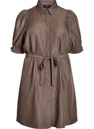 Knælang skjortekjole i 100% genanvendt polyester med gennemgående knaplukning og aftageligt bindebælte i taljen. Kjolen har en klassisk skjortekrave, korte ærmer med smockkant, som skaber en let pufeffekt og en regulær pasform.