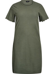 Knælang kjole i blød og behagelig bomuldsjersey med ribstruktur. Kjolen har en rund hals, korte ærmer med bølget kant og en tætsiddende pasform.
