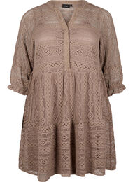 Kort kjole i feminint blondemateriale med løs pasform og skæringer, som skaber et flot a-snit. Kjolen har v-udskæring, kort skjult knaplukning samt 3/4 ærmer med elastisk flæsekant og en blød underkjole.