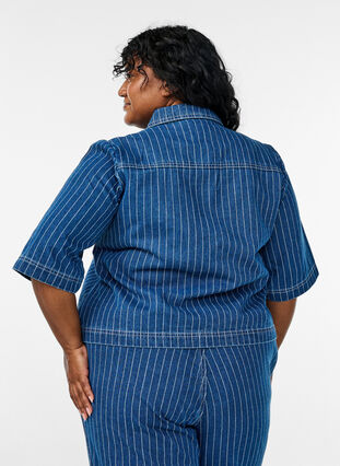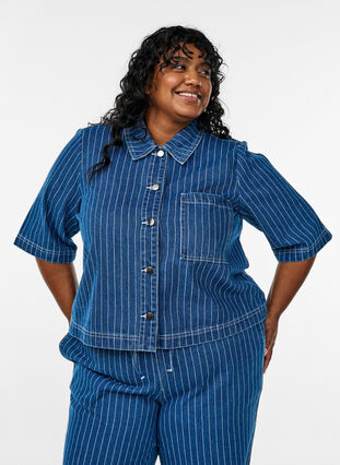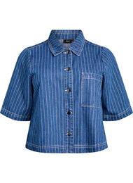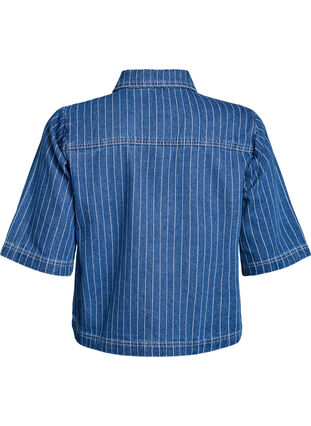 Kort denim skjorte med smalle striber i en blød og behagelig denimkvalitet med let stretch. Skjorten har albuelange ærmer, krave, brystlomme og en afslappet pasform med knaplukning foran.