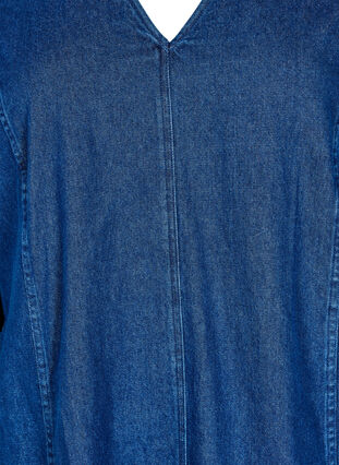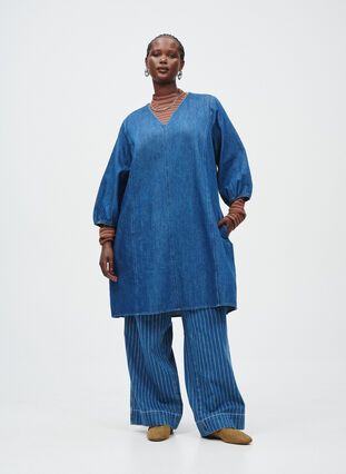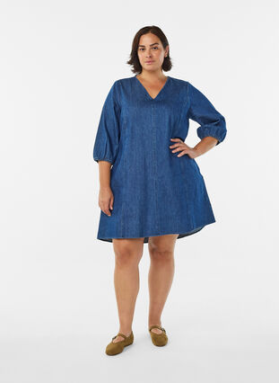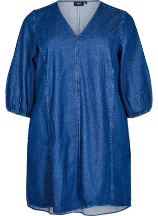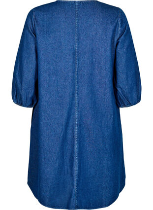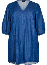 Kort denimkjole i 100% bomuld med regulær pasform samt dekorative syninger foran og bagpå, der tilfører designet et enkelt og stilrent udtryk. Kjolen har V-hals, sidelommer og 3/4 lange ballonærmer med elastik ved ærmekanterne.