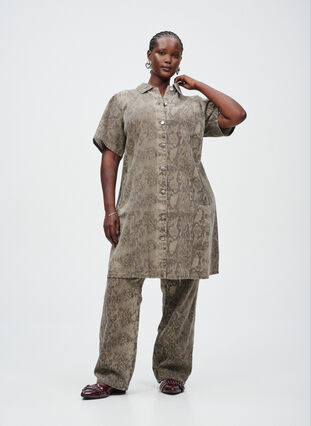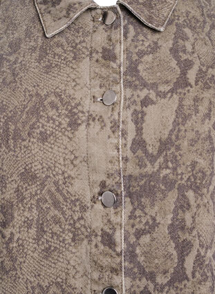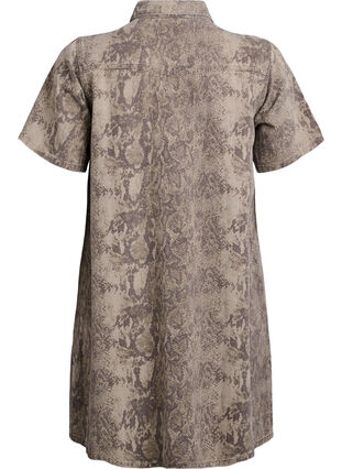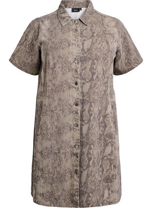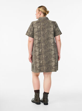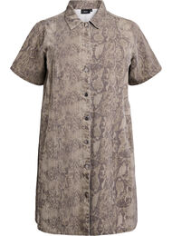 Kort skjortekjole i denim af 100 % bomuld med slangeprint og en vasket finish. Modellen har klassisk krave, korte ærmer, fuld knaplukning og sidelommer. Pasformen er let A-formet, så kjolen falder flot over kroppen.