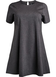 Jerseykjole i et tidløst design med kort længde og flot A-facon, der skaber en let og feminin silhuet. Kjolen er lavet i et blødt og strækbart materiale med viskose, som sikrer en behagelig og fleksibel pasform. Modellen har rund hals, korte ærmer og en lille nøglehulsåbning med knaplukning i nakken, der tilfører et diskret pift til det ellers enkle design. En alsidig kjole, der nemt kan styles op eller ned – alt efter anledning.