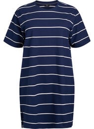 Kort jerseykjole med rund hals, korte ærmer og en afslappet pasform. Kjolen er lavet i en blød og strækbar bomuldsjersey og har slidser i siderne, som giver ekstra bevægelsesfrihed. Designet fuldendes af det klassiske, stribede mønster, der giver et casual og tidløst udtryk.