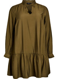 Kort kjole i en blød, let kvalitet med løs A-form og bred, rynket flæsekant forneden, som skaber en afslappet og feminin silhuet. Modellen har lange ærmer med manchet og lille flæsekant samt en flæsekrave med bindebånd og dekorative kvaster foran. Denne kjole indeholder 86 % LENZING™ ECOVERO™ viskose-fibre, som tilfører naturlig blødhed og fald