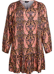 Farverig kort kjole med et smukt paisleyprint. Modellen har V-udskæring, lange ærmer med elastikkant samt en løs pasform med en bred flæsekant forneden. Denne kjole indeholder 50% LENZING™ ECOVERO™ Viskose-fibre, som tilfører naturlig blødhed og fald.