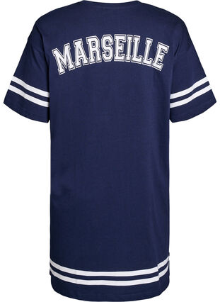 Kort t-shirtkjole i 100% bomuld med løs pasform og sporty udtryk. Kjolen har rund hals med ribkant samt korte ærmer og kant forneden med matchende stribedetalje, der giver en gennemført, atletisk stil. På brystet er der et trykt sportstrøje-nummer, og ryggen har et større tekstmotiv, som fuldender det afslappede design.