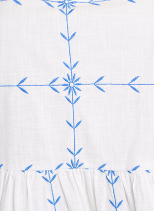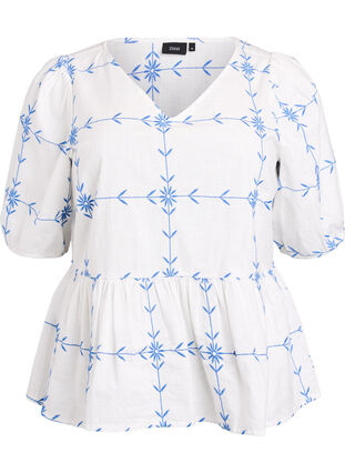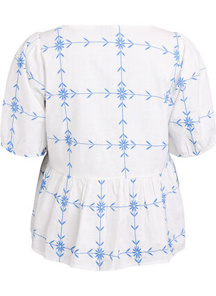 Bluse i 100% bomuld med et flot, kontrastfarvet grafisk broderi. Blusen har V-udskæring, korte ærmer med elastikkant og en A-formet pasform med skæring i taljen, som skaber en feminin silhuet.