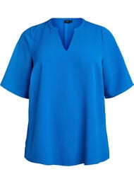 Ensfarvet bluse med v-udskæring og korte ærmer. Blusen har en løstsiddende pasform og er lavet i en let kvalitet med 55% genanvendt polyester.
