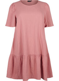 Kort kjole i 100% blød bomuld med løs pasform og skæring i bunden, som giver en flot a-formet silhuet. Kjolen har en rund hals og korte ærmer med rynkeeffekt på skuldrene.