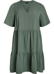 Kortærmet kjole i et let materiale med 55% genanvendt polyester. Kjolen har v-hals og skæringer, som giver et flot fald til den løse a-form.