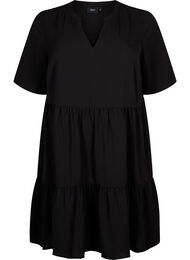 Kortærmet kjole i et let materiale med 55% genanvendt polyester. Kjolen har v-hals og skæringer, som giver et flot fald til den løse a-form.