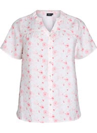 Kortærmet skjortebluse i blød viskosekvalitet med blomsterprint. Skjorteblusen har V-udskæring, små læg ved brystet og en regulær pasform med gennemgående knaplukning.