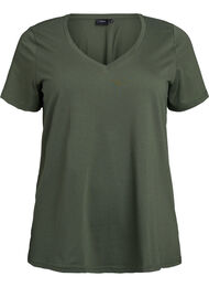 Ensfarvet basis t-shirt i en blød bomuldsblanding, som har korte ærmer og v-udskæring.
