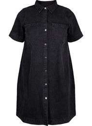 Lang denimskjorte i 100% bomuld med et løst a-snit. Skjortekjolen er designet med en spids krave, korte ærmer, brystlommer og trykknapper.