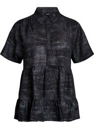 Kortærmet bluse i et let materiale med klassisk krave og en kort, skjult knaplukning foran samt rynkedetalje ved skuldrene. Blusen er længere bagtil og har en løs pasform med to skæringer og rynkeeffekt, der skaber en luftig og levende silhuet.