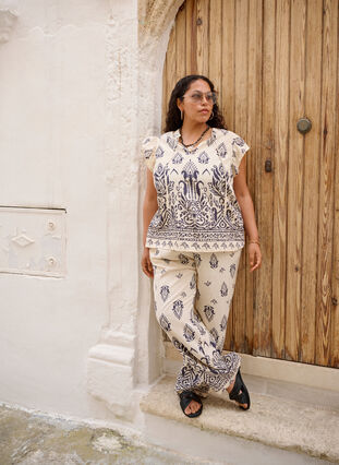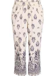 Bukser i en blød og let viskosekvalitet med et dekorativt all-over print. Bukserne har en løs pasform med lige ben, sidelommer og en høj talje med elastik og bindebånd.