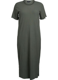 Maxikjole i en blød og strækbar bomuldsjersey med ribstruktur. Modellen har en rund hals og korte ærmer med bølget kant, der giver et feminint touch. Pasformen er tætsiddende og kjolen har slidser i begge sider for ekstra bevægelighed.