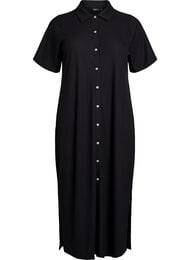 Skjortekjole i maxi-længde, fremstillet i en blød og strækbar jerseykvalitet med stribet struktur. Kjolen har klassisk krave, korte ærmer og gennemgående knaplukning foran. Den regulære pasform og slidser i siderne giver en afslappet silhuet med flot fald og god bevægelighed.