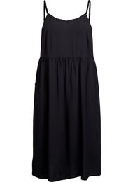 Midilang stropkjole med V-udskæring og flettede stropper. Kjolen er designet med en skæring i taljen og har en elastisk smock-detalje bagpå, som sikrer komfortabel pasform. Denne kjole indeholder 100% LENZING™ ECOVERO™ Viskose-fibre, som tilfører naturlig blødhed og fald.