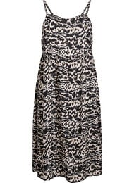 Midilang stropkjole med V-udskæring og flettede stropper. Kjolen er designet med en skæring i taljen og har en elastisk smock-detalje bagpå, som sikrer komfortabel pasform. Denne kjole indeholder 100% LENZING™ ECOVERO™ Viskose-fibre, som tilfører naturlig blødhed og fald.